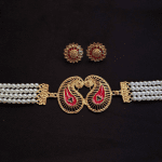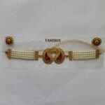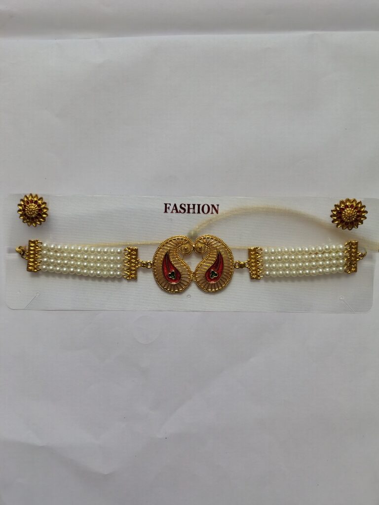 Adorn yourself with timeless charm with this exquisite imitation waist belt set. Featuring multiple strands of lustrous pearls beautifully joined with a dual-paisley motif centerpiece in gold and vibrant red enamel, it exudes traditional elegance. Paired with matching floral stud earrings encrusted with sparkling stones, this set is perfect for weddings, festive occasions, or cultural celebrations.